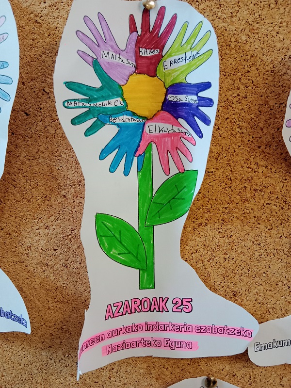 Egun honetarako Haur eta Lehen Hezkuntzako Hezkidetza taldeak hainbat proposamen partekatu dizkigu irakasleei geletan ikasleekin lantzeko. Esaterako, abesti, bideo, ipuin… desberdinen inguruko hausnarketa egin dute eta ondoren, horiekin lotutako hormairudiak eta eskuak egin dituzte ikastetxeko pasiloak apainduz. Eguna girotzeko, egun honi erreferentzia egiten dioten hainbat abesti entzun ditugu sarrera-irteera zein patio orduetan. Bestalde, ikastetxeko irakasle zein ikasleek, morez jantzita, giza kate erraldoia egin dugu ikastetxeko frontoi handian.