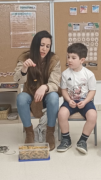 Oraingoan 5 urteko geletan izan dugu bisita, Leire Larreta, hain zuzen ere. Leire eskulan polit batekin etorri zaigu, eta ezin izan zaigu gehiago gustatu. Makarroiekin lepokoak eta eskumuturrekoak egin ditugu! Leirek jarraitu beharreko pausoak eta erabili beharreko materialak erakutsi ondoren, martxan jarri gara eta bakoitzak bere lepoko edota eskumuturrekoa egin du. Oso gustura aritu gara Leirerekin batera eskulanak egiten.