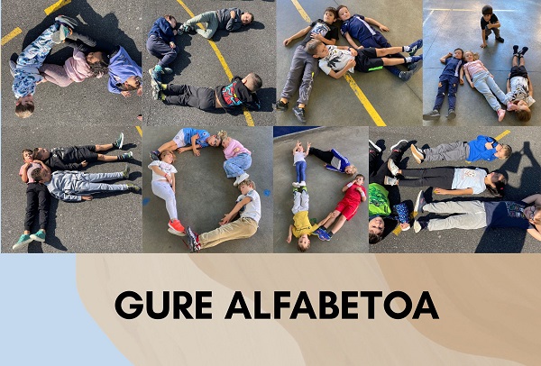 Pixkanaka irakurtzen eta idazten ikasten ari gara, eta oraingo honetan jarduera dibertigarri bat egin dugu. Gure gorputza, mugimendua eta irudimena erabiliz, alfabetoko hizkiak lurrean marraztu ditugu.
