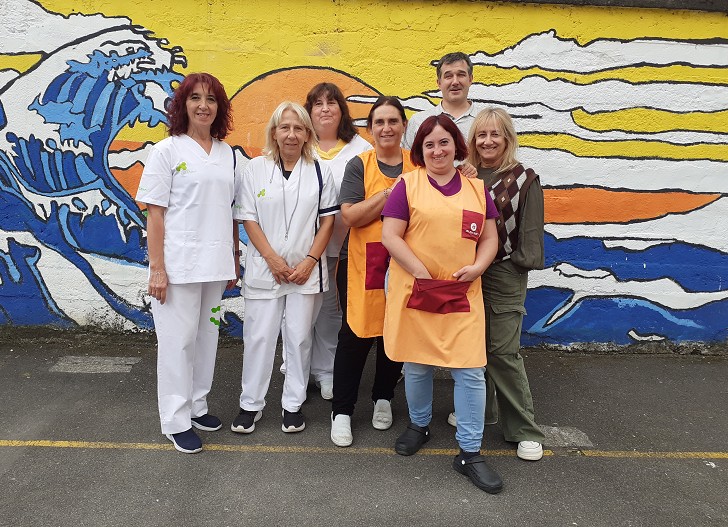 Ezkerretik eskuinera: Consuelo Frutos (garbitzailea), Toñi Perianes (garbitzailea), Garbiñe Laskurain (sukaldaria), Olatz Petrina (jangelako begiralea), Naiara Utxa (jangelako begiralea), Aner Elorza (administraria) eta Marijo Ciganda (atezaina).